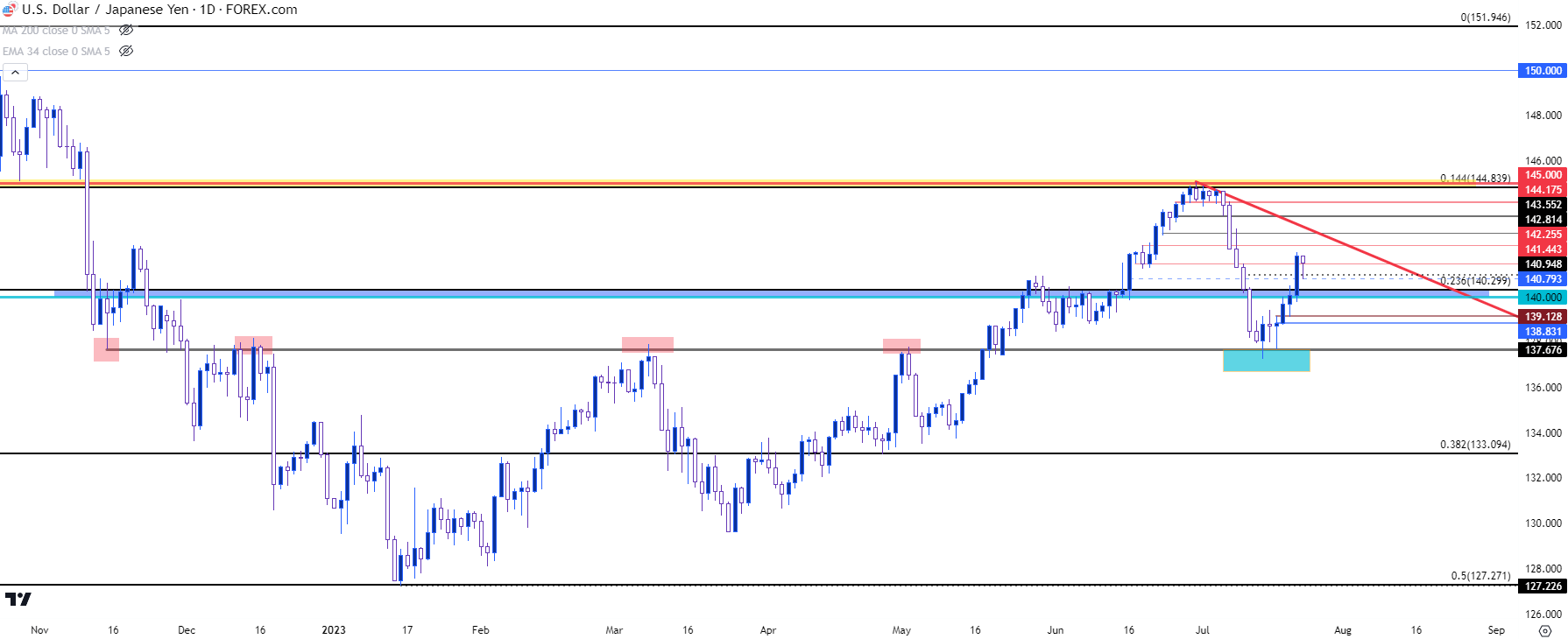 最近在该点位产生的阻力拐点发生在日本央行利率决议后不久,这是新行长植田和男的首次利率会议。在那次会议上,市场欢呼雀跃,因为领导层的更迭看来不会对央行政策造成什么干扰。迄今为止,即使日本的通胀仍然高企,也几乎没有变化的迹象。