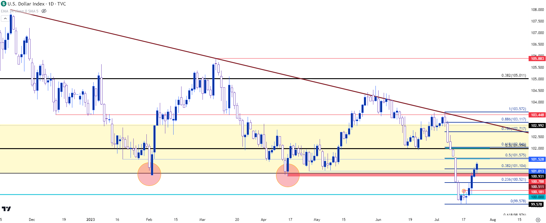 但是正如我在那之后不久所说的最大的问题是空头还有多少决心,我已经强调过先前作为支撑的区域,关注走低的高点阻力位会如何起作用。该区域位于2023年上半年的支撑位附近,在DXY图表上的100.80-101区域附近。